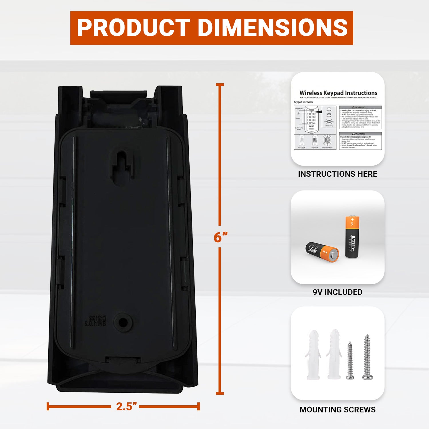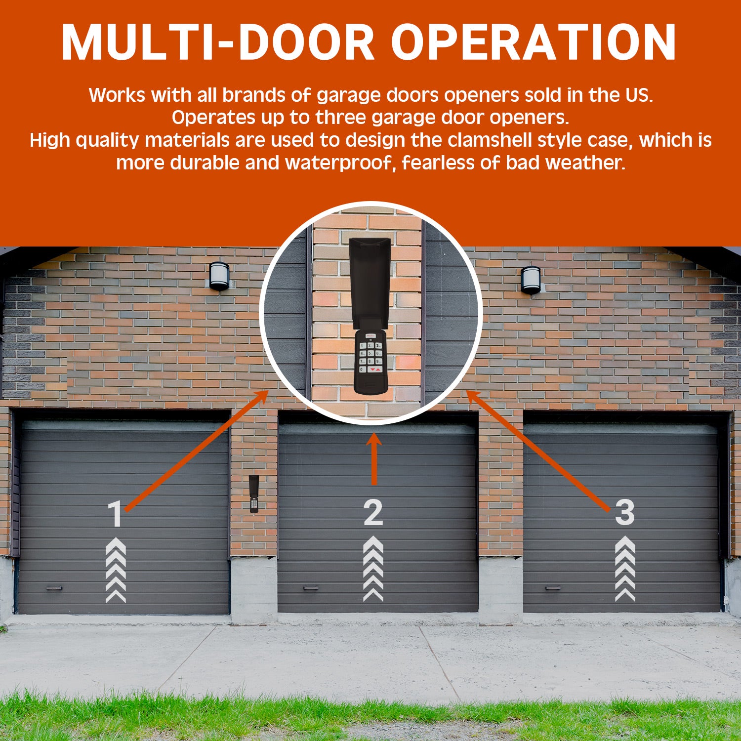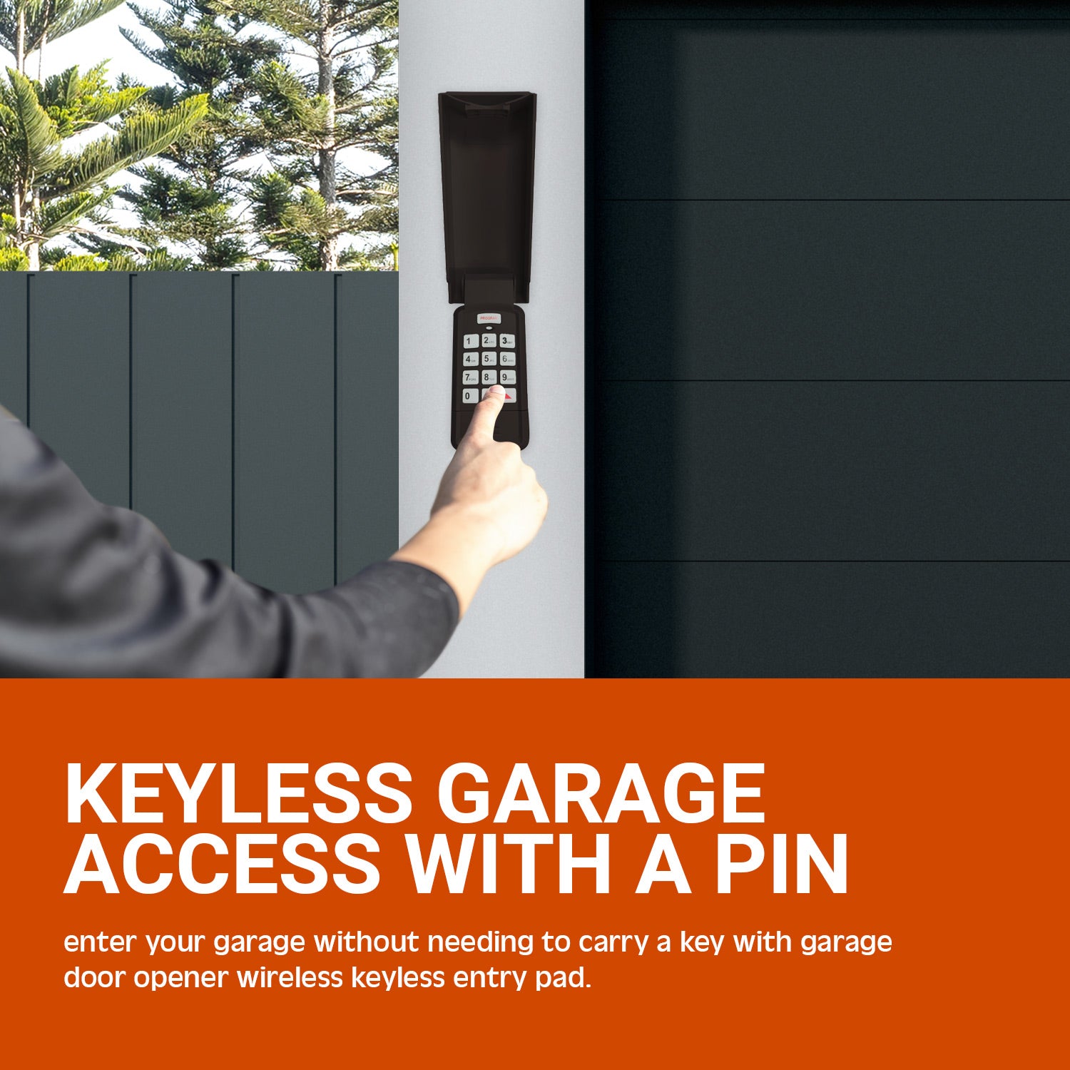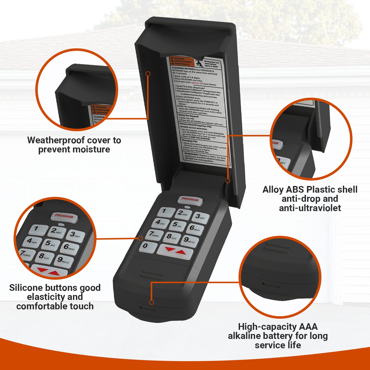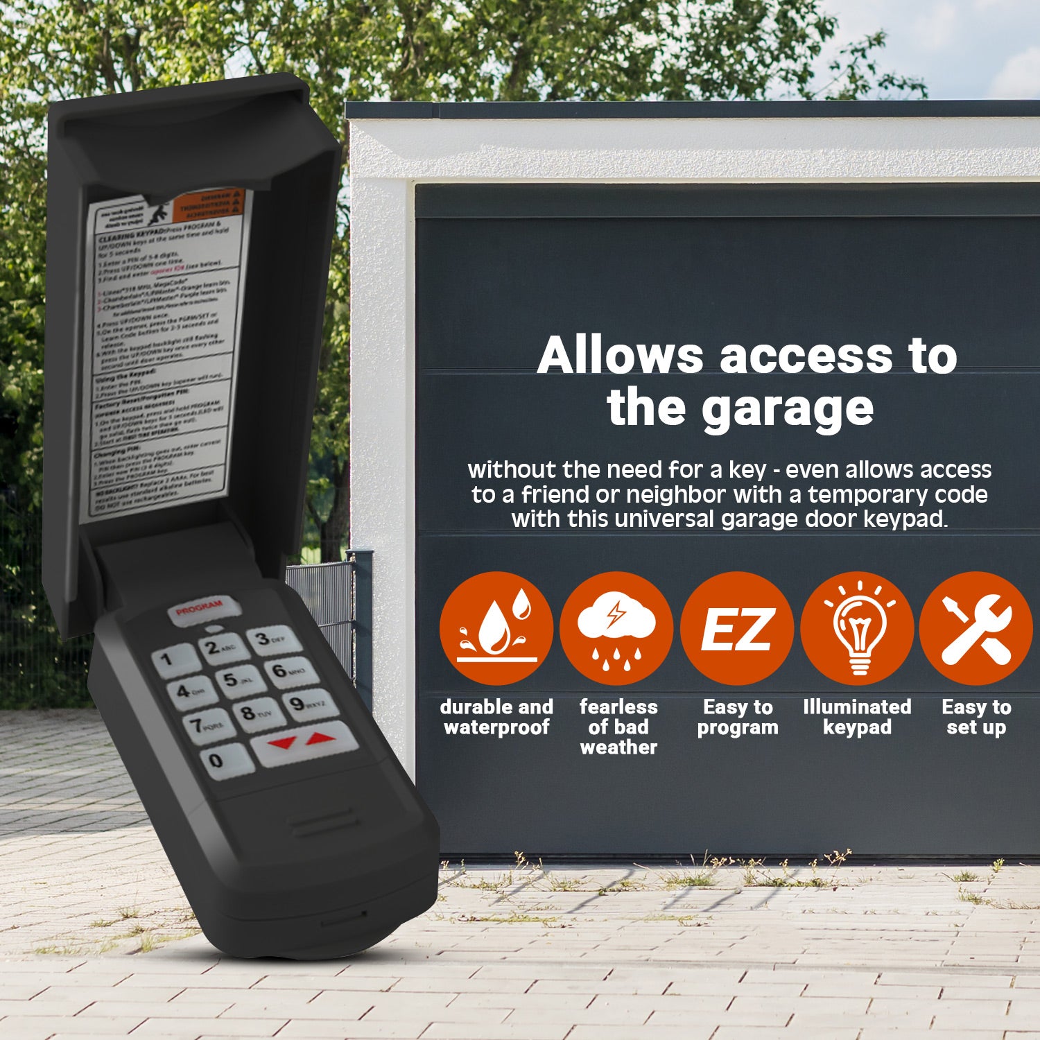 The wireless garage door opener keypad has a flip-up cover for weather protection. Large backlit buttons on the universal keypad make entering a PIN quick and easy;