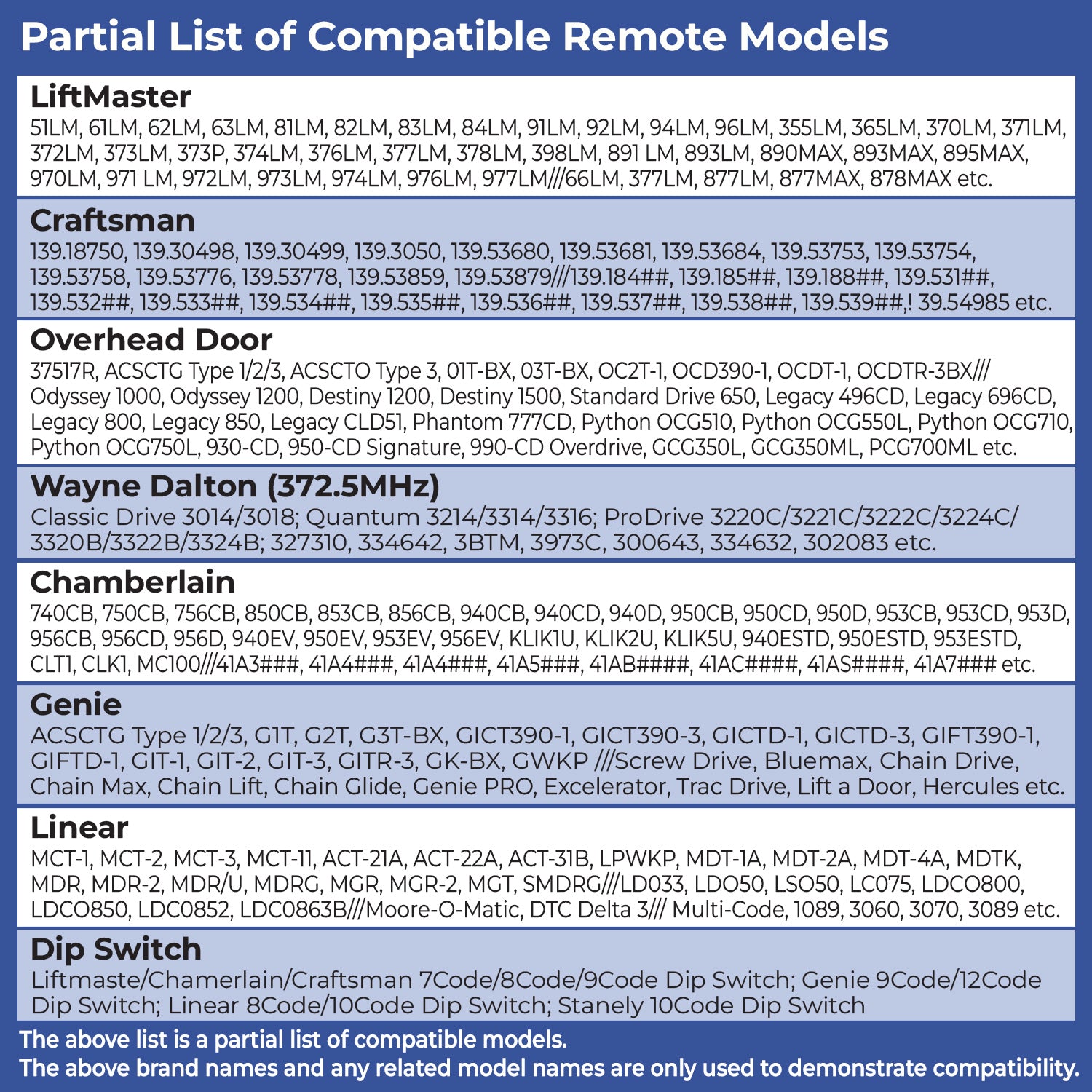 Compatible with Linear, Marantec, EzCode, Wayne Dalton, Genie, Overhead Door, Liftmaster, Chamberlain, Craftsman and more. Applicable for Purple/Yellow/Red/Orange/Green color learn button or Dip Switch. Works multi-frequency 300/310/315/318/372.5/390MHz etc.